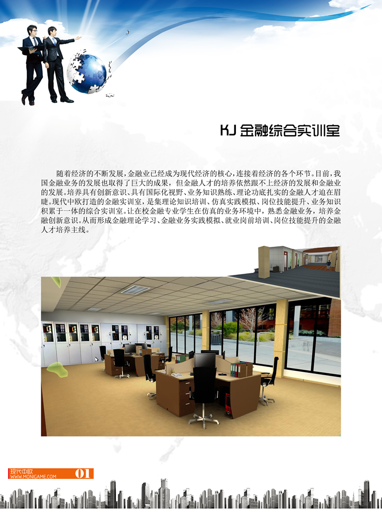 金融綜合實訓(xùn)室建設(shè)方案主要是基于“互聯(lián)網(wǎng)+”“大眾創(chuàng)業(yè),萬眾創(chuàng)新”時代背景,落實國務(wù)院辦公廳《關(guān)于深化產(chǎn)教融合的若干意見》。深化高等教育、職業(yè)教育等改革,發(fā)揮企業(yè)重要主體作用,促進金融專業(yè)人才培養(yǎng)供給側(cè)和產(chǎn)業(yè)需求側(cè)結(jié)構(gòu)要素全方位融合,協(xié)同高校培養(yǎng)大批高素質(zhì)創(chuàng)新人才和技術(shù)技能人才。以“人才培養(yǎng)與產(chǎn)業(yè)需求相對接、教學(xué)內(nèi)容與職業(yè)標準相對接,教學(xué)過程與生產(chǎn)過程相對接”的現(xiàn)代高等教育發(fā)展觀為指導(dǎo),金融綜合實訓(xùn)室總體布局圍繞“產(chǎn)業(yè)服務(wù)流程”和“學(xué)生能力提升”為核心,按照以下四條邏輯主線貫穿設(shè)計。