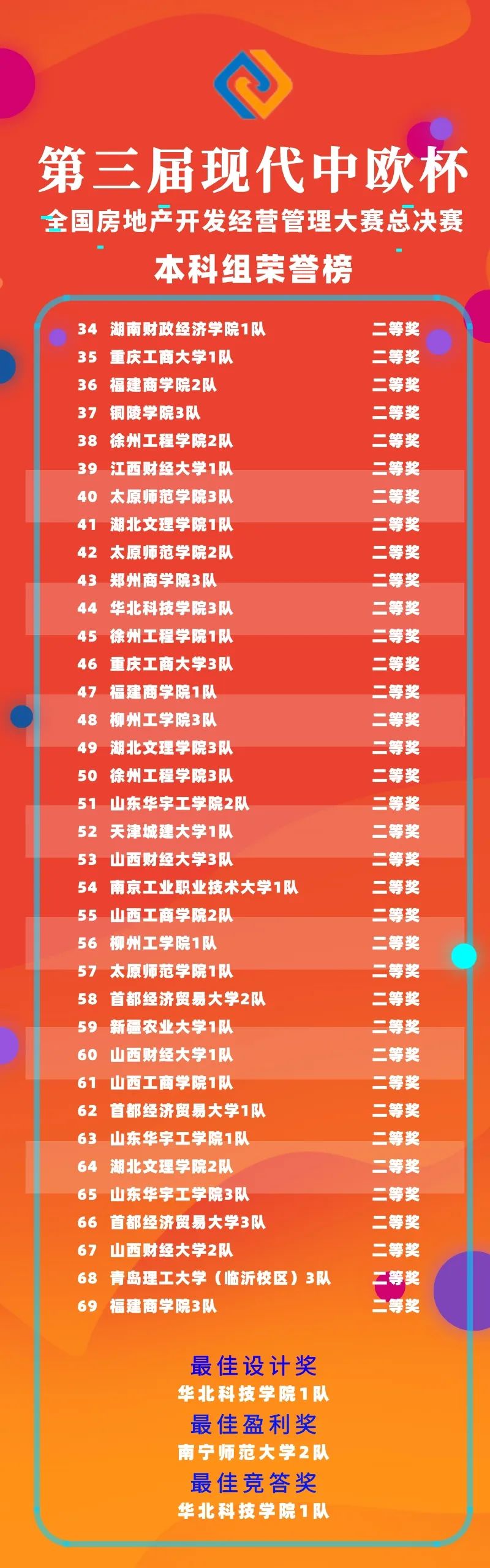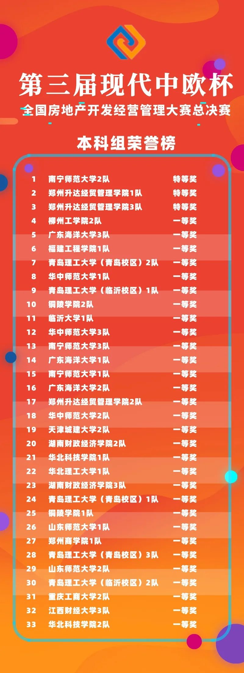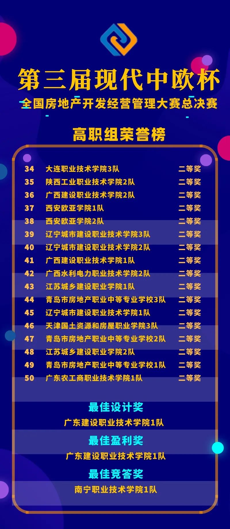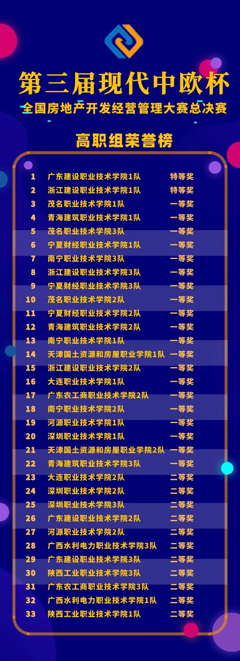 經(jīng)過(guò)線上競(jìng)賽的激烈比拼,第三屆“現(xiàn)代中歐杯”全國(guó)房地產(chǎn)開(kāi)發(fā)經(jīng)營(yíng)管理大賽總決賽獲獎(jiǎng)名單揭曉。