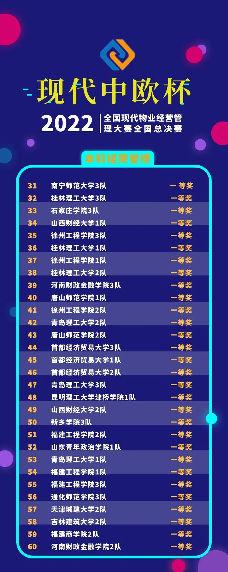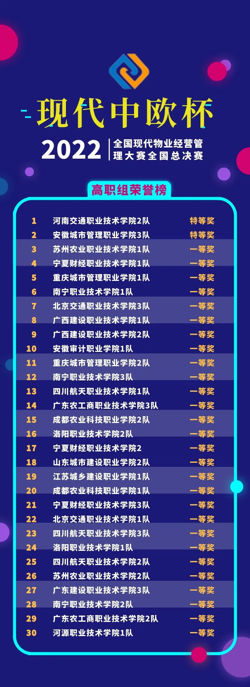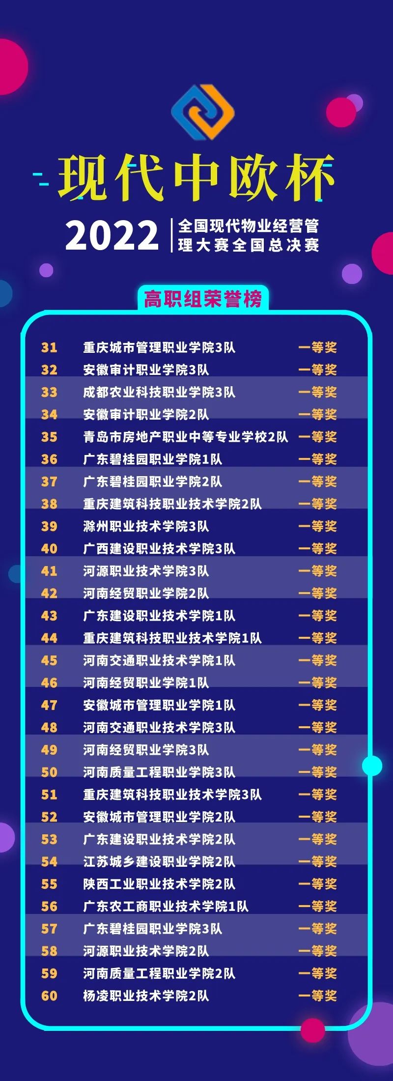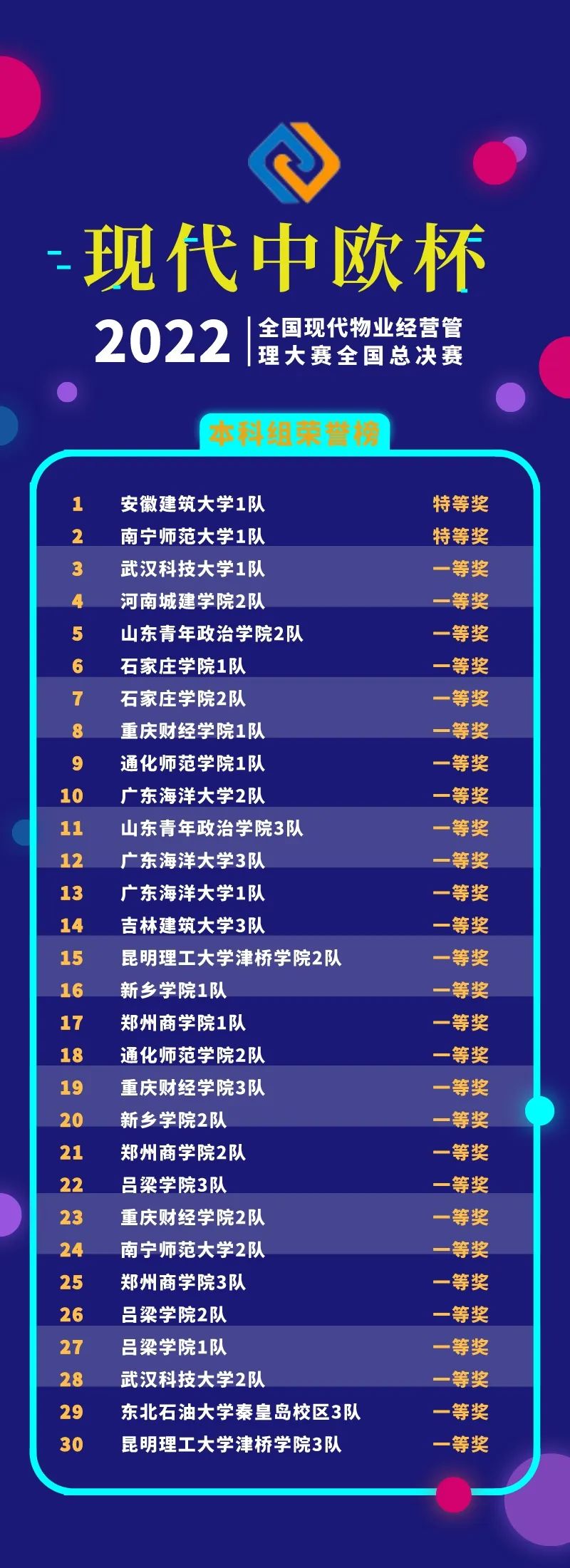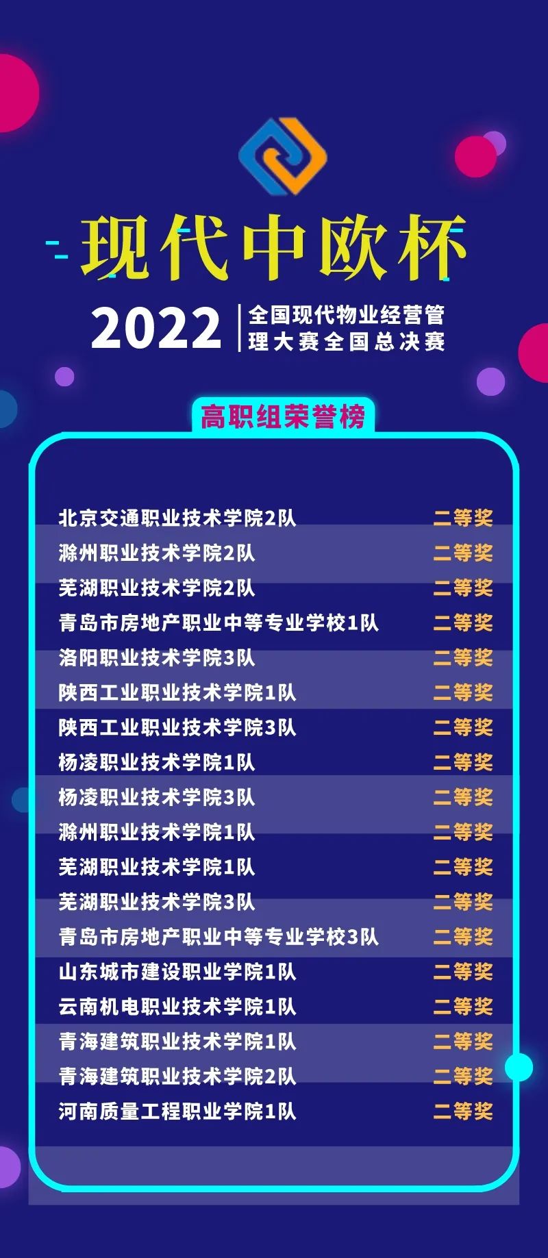 經(jīng)過線上競賽的激烈比拼,2022年“現(xiàn)代中歐杯”全國現(xiàn)代物業(yè)經(jīng)營管理大賽全國總決賽獲獎(jiǎng)名單揭曉。